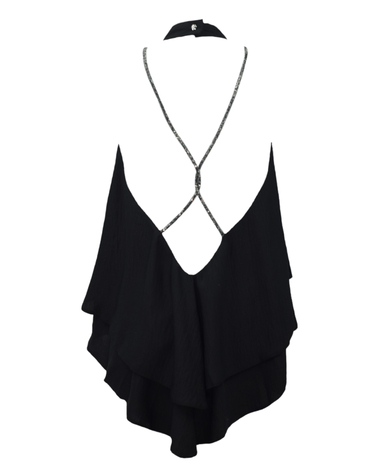 * топ- силно разкроен , два слоя къдри и гръб с кристални презрамки , които е като истинско бижу.